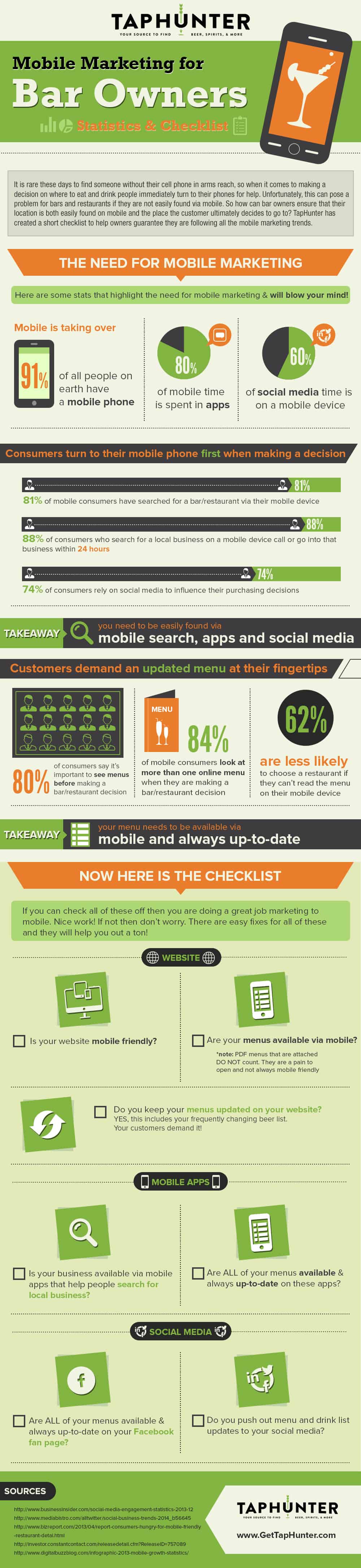 Recently, the team at Evergreen compiled a list of mind blowing stats to highlight the importance of this growing trend. In addition, they created a short checklist so bar and restaurant owners can guarantee they are beating the competition when it comes to mobile marketing. Check out the visual below to see these statistics and checklist for yourself!